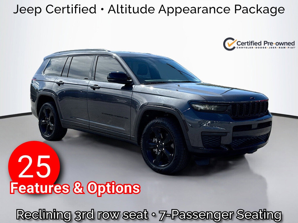 Multi-Point Inspection, w/ Oil Change, Smog Completed, & Full Vehicle Detail Insided & Out, Wiper Blades are New all around, Cabin Air Filter is New, Engine Air Filter is New, 115V Auxiliary Power Outlet, 2nd Row 60/40 Bench w/Manual Tip/Slide, 2nd Row Seat Center Armrest/Cupholders, 3 Rear Seat Head Restraints, 3.45 Rear Axle Ratio, 3rd Row Charge-Only USB Ports, 3rd row seats: split-bench, 4-Wheel Disc Brakes, 6 Speakers, 7-Passenger Seating, ABS brakes, Air Conditioning, Alloy wheels, Altitude Appearance Package, Anti-whiplash front head restraints, Automatic temperature control, Black Headliner, Brake assist, Bumpers: body-color, Capri Leatherette/Suede Seats, Center Rear 3-Point Seat Belt, Cloth Seats, Compass, Delay-off headlights, Delete Laredo Badge, Driver door bin, Driver vanity mirror, Dual front impact airbags, Dual front side impact airbags, Electronic Stability Control, Emergency communication system, Four wheel independent suspension, Front anti-roll bar, Front Bucket Seats, Front Center Armrest w/Storage, Front dual zone A/C, Front License Plate Bracket, Front reading lights, Fully automatic headlights, Gloss Black Exterior Accents, Heated door mirrors, Heated Front Seats, Heated Steering Wheel, Illuminated entry, Knee airbag, Low tire pressure warning, Manual Fold Seatbacks, Molded In Color Black/Gloss Black Roof Rails, Normal Duty Suspension, Occupant sensing airbag, Outside temperature display, Overhead airbag, Overhead console, Panic alarm, ParkView Rear Back-Up Camera, Passenger door bin, Passenger vanity mirror, Power door mirrors, Power driver seat, Power Liftgate, Power steering, Power Sunroof (DISC), Power windows, Quick Order Package 22B Altitude, Radio data system, Radio: Uconnect 5 w/8.4" Display, Rain Sensitive Windshield Wipers, Rear air conditioning, Rear anti-roll bar, Rear reading lights, Rear window defroster, Rear window wiper, Reclining 3rd row seat, Remote keyless entry, Remote Start System, Security system, Selectable Tire Fill Alert, Speed control, Speed-Sensitive Wipers, Split folding rear seat, Spoiler, Steering wheel mounted audio controls, Tachometer, Telescoping steering wheel, Tilt steering wheel, Traction control, Trip computer, Variably intermittent wipers, Voltmeter, Wheels: 18" x 8.0" Fully Painted Aluminum, Wheels: 18" x 8.0" Fully Painted Aluminum 1, Wheels: 20" x 8.5" Gloss Black Painted Aluminum, Wireless Charging Pad.